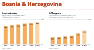 Bosna i Hercegovina ubrzano popravlja svoj digitalni zamah. Prema podacima iz izvještaja, u 2024. internet koristi 87% građana (dob 16–74), dok je broj onih koji su kupovali online porastao na 44%. Očekuje se da će do 2025. penetracija interneta u BiH dosegnuti 90%, a udio redovnih e-kupaca porasti na oko 56%. Više od polovine potrošača već kupuje online bar jednom mjesečno, a gotovo četvrtina domaćih web-trgovina prodaje robu i usluge potrošačima u inostranstvu.