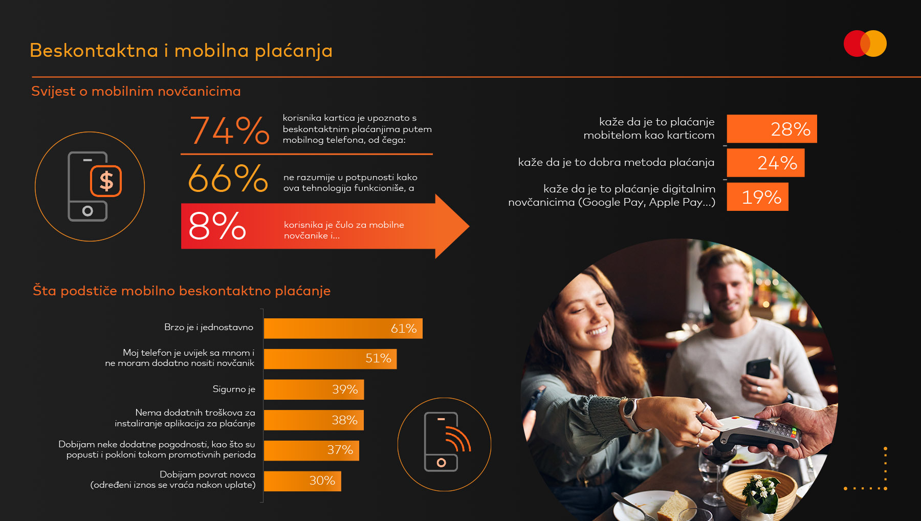 Mobilna i online plaćanja su u porastu, ali još uvijek nisu svakodnevica većine korisnika. Iako 74% ispitanika zna za beskontaktna plaćanja putem mobilnog telefona, dvije trećine ne razumije kako tehnologija funkcioniše, a 70% i dalje radije plaća fizičkom karticom.